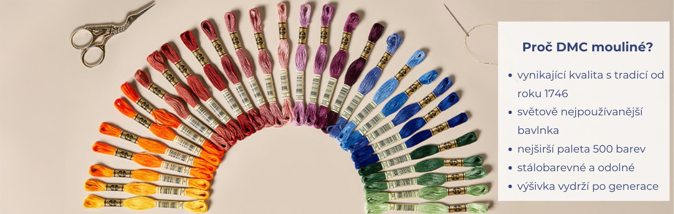 Na dmc-vysivani.cz najdete vyšívací příze DMC, vyšívací sady, látky a pomůcky doplněné o odborné návody, které vám pomohou správně vybrat materiál i postup – od začátečníků po pokročilé.