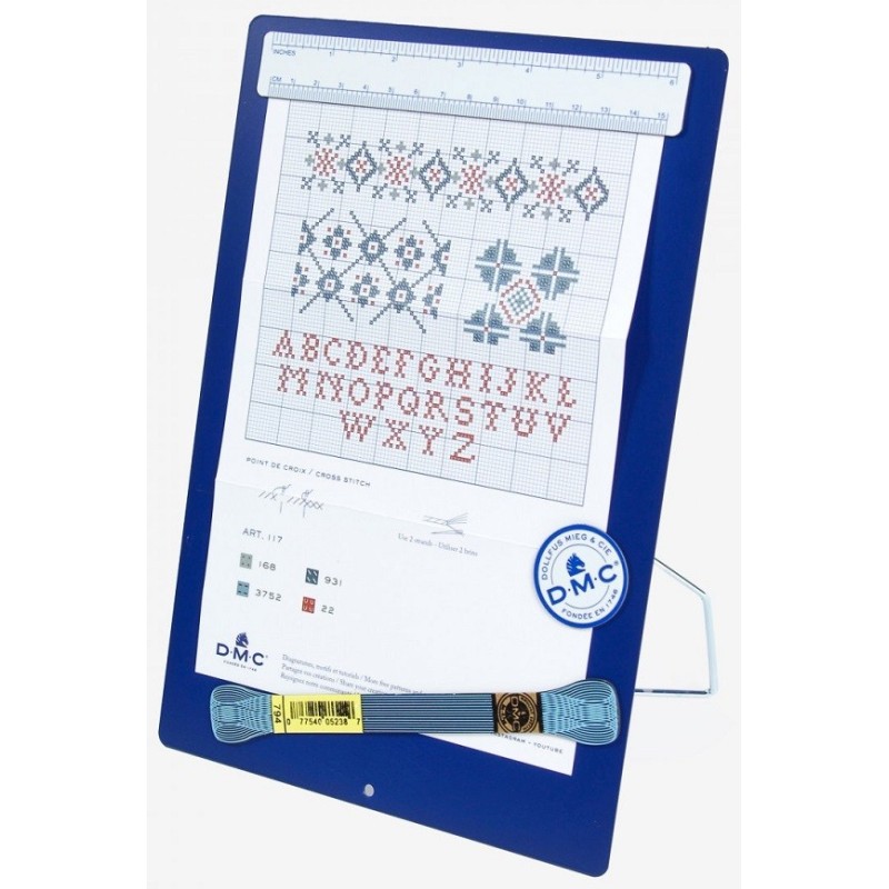 Magnetická tabule se sklápěcím stojánkem v zadní části a 3 stylovými magnety (ve tvaru pravítka, bavlnky a loga DMC). Pomocí magnetického pravítka můžete číst vyšívací předlohy a schémata řádek po řádku.