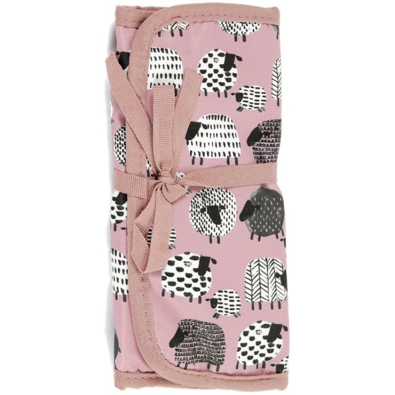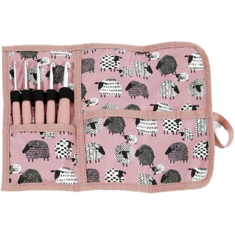 Úžasná sada 5 pletacích háčků (velikost 3 mm, 4 mm, 5 mm, 6 mm a 8 mm) v růžovém látkovém pouzdru s potiskem oveček