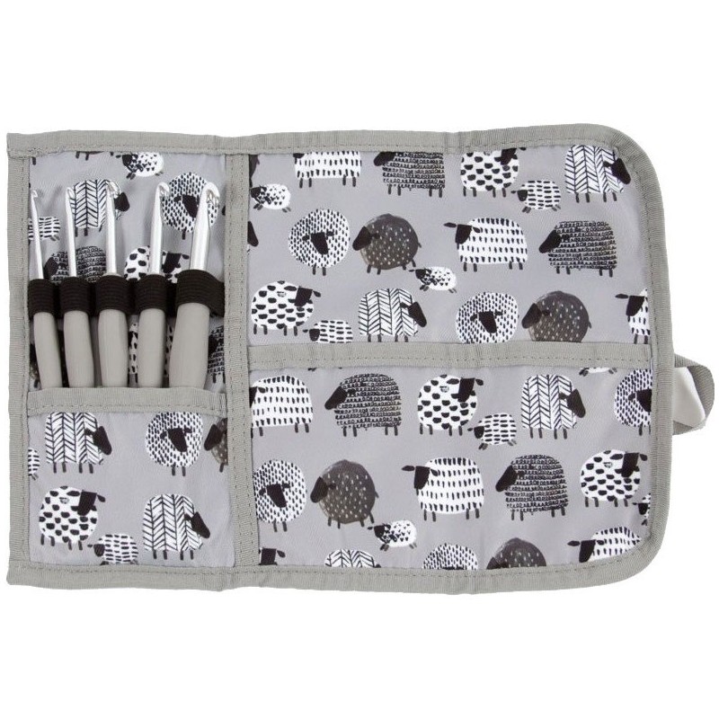 Úžasná sada 5 pletacích háčků (velikost 3 mm, 4 mm, 5 mm, 6 mm a 8 mm) v šedém látkovém pouzdru s potiskem oveček